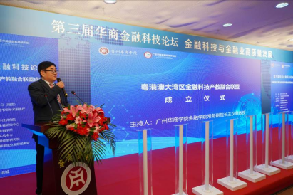 本次论坛的一项重要内容是举行“粤港澳大湾区金融科技产教融合联盟”成立仪式。主旨演讲结束后,金融学院常务副院长王汉章教授主持了该仪式并宣读联盟发起单位名单,共22家单位。