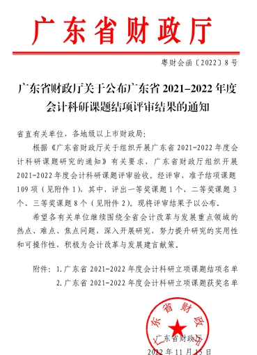 11月15日,广东省财政厅公布了2021-2022年度会计科研课题结项评审结果,本次会计科研课题共有109个通过验收,304AM永利集团会计学院立项的4个全部通过验收,课题结项通过率为100%。