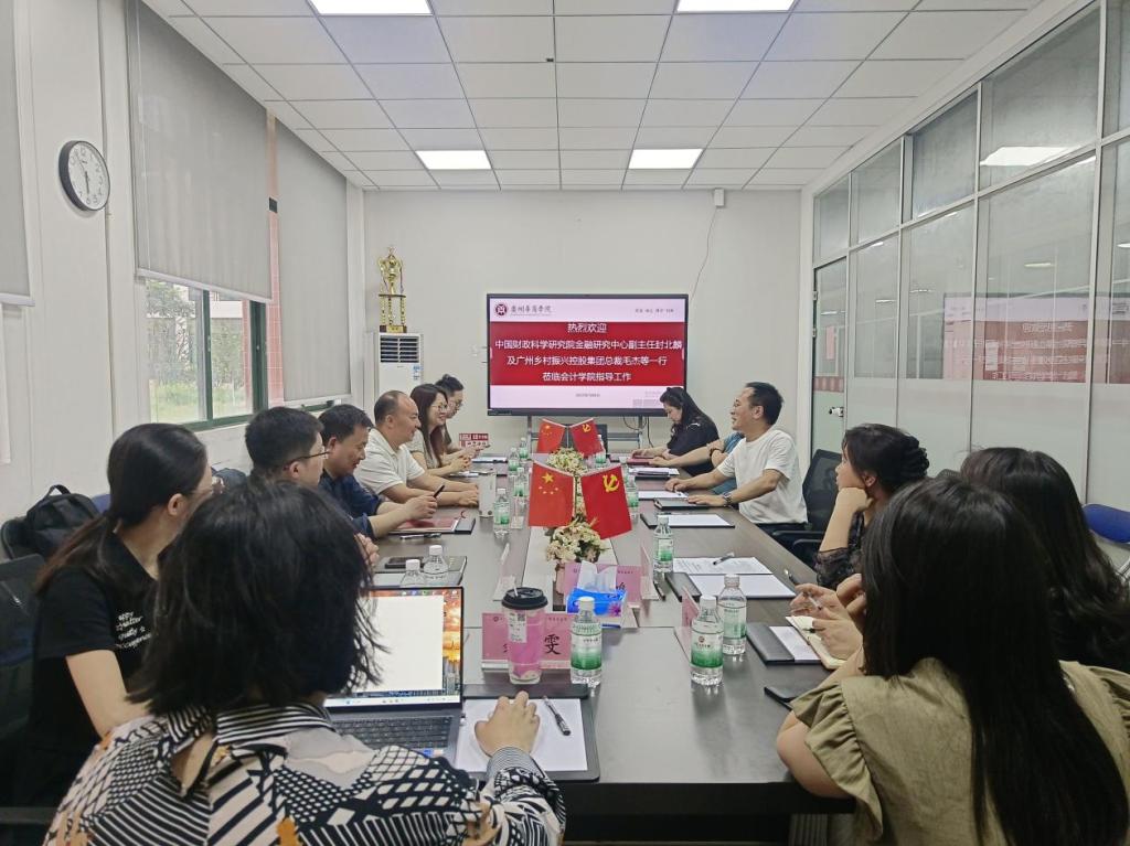 2025年5月8日下午,中国财政科学研究院金融研究中心副主任封北麟、副研究员黄亦炫、助理研究员黄宝竹及广州乡村振兴控股集团总裁毛杰、副总裁何青倩等莅临会计学院指导交流。会计学院党委书记刘善球,副院长杨旻、周书域,以及院长助理陈蒙梦、陈平等共同参会。双方围绕“乡村振兴战略落地”与“应用型人才培养”两大主题展开思维碰撞。
