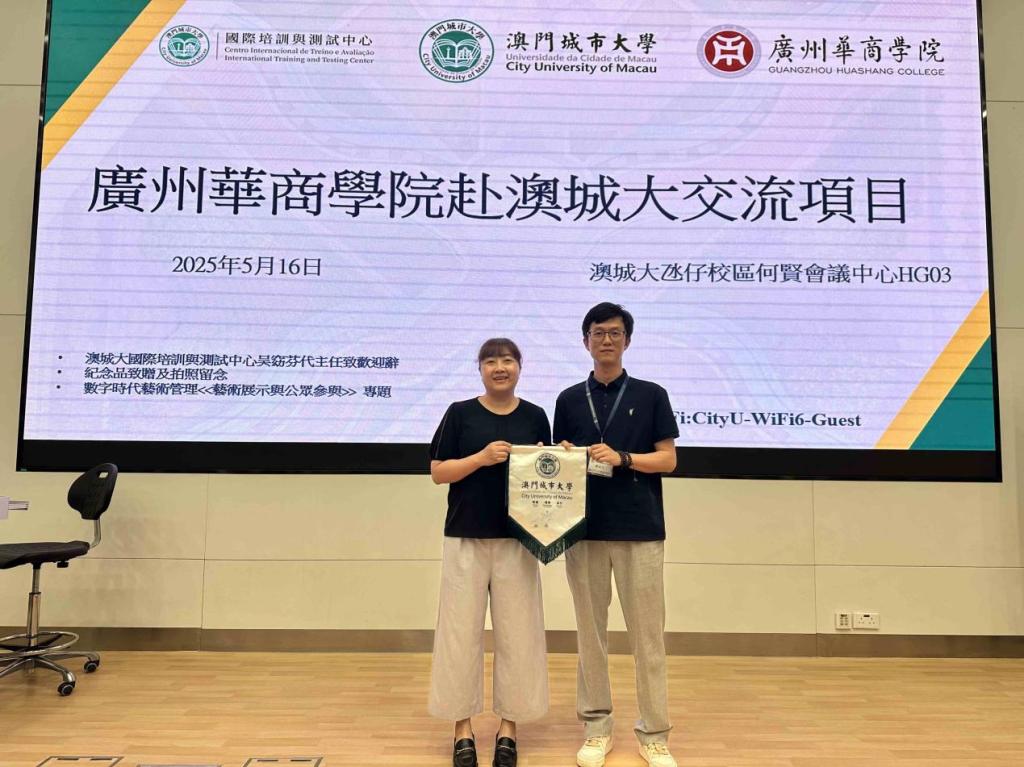 5月16日下午,教师团队抵达澳门城市大学。国际培训与测试中心主任吴窈芬女士致欢迎词,对数字传播学院教师团队的到访表示热烈欢迎,并简要介绍了澳门城市大学在国际合作与数字艺术教育方面的发展布局。数字传播学院院长助理侯兆丰副教授随后代表学院致答谢词,双方进行了纪念品互赠与合影留念,现场气氛友好热烈。
