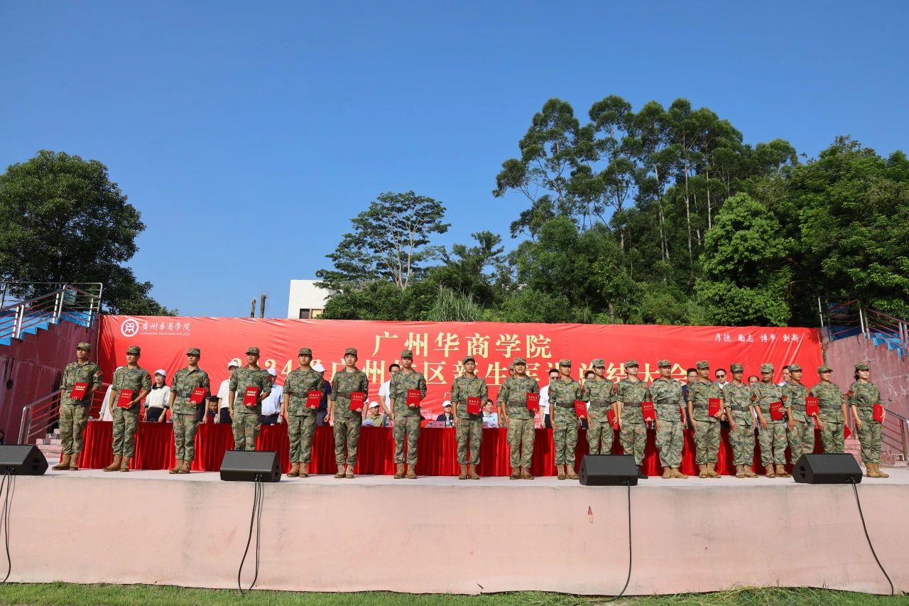 校长助理李远飞宣读《关于表彰2024级广州校区新生军训优秀集体及个人的决定》。主席台上的校领导向荣获先进营称号、标兵连队称号、先进连队称号、精神文明连队称号的连队及荣获优秀教官、军训标兵称号的22名教官、128名新生进行表彰。