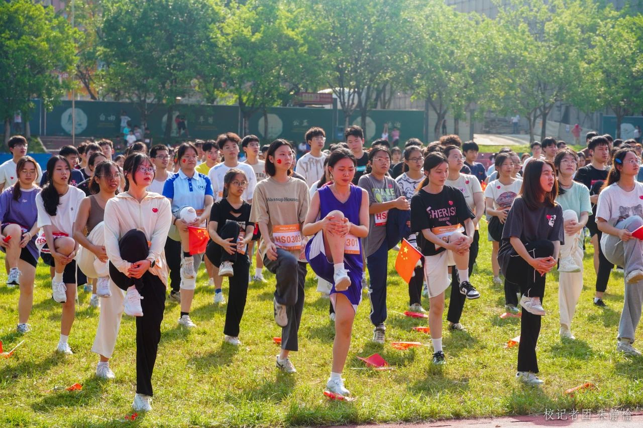 在体育学院教师的带领下,师生共同进行热身准备活动,从摆臂伸展到跳跃拉伸,从马步压腿到体转放松,每一个动作都洋溢着青春的活力。