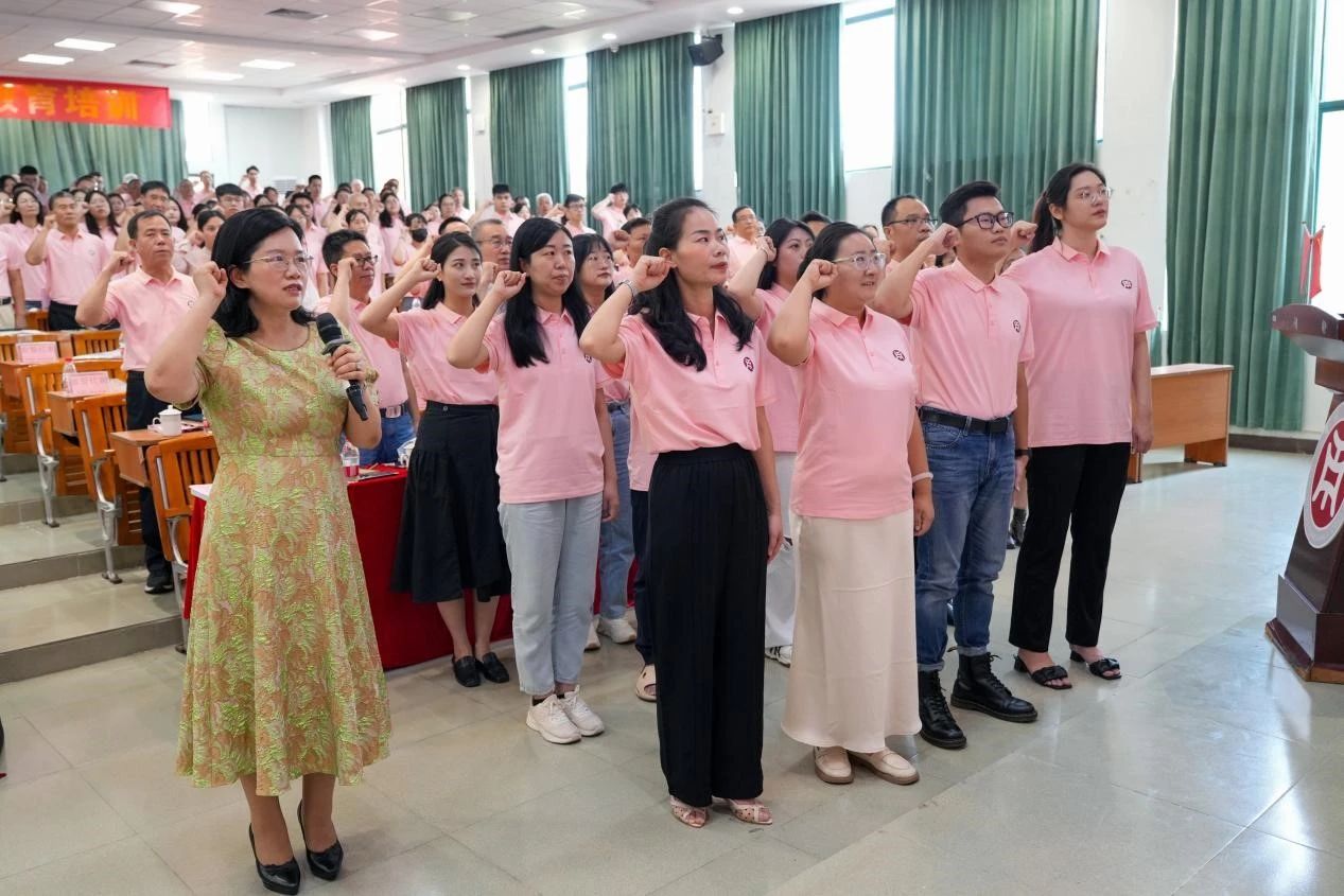 304AM永利集团2024年新教师入职教育第一场集中培训在庄严的国歌声中拉开序幕。党委书记陈玉欢代表学校对新教师表示热烈的欢迎和衷心的祝福。她表示,新入职教师是华商的新鲜血液,是学校朝气蓬勃精神面貌的体现,希望新教师能尽快转变角色、快速成长。会上,全体新教师在党委书记陈玉欢的带领下,进行庄严的入职宣誓仪式。坚定有力的誓词回荡在报告厅内,新教职工必将秉承“厚德、励志、博学、创新”的校训,做学生良师益友,铸教师高尚人格,为全体学生美好未来、华商学院教育发展而不懈努力。