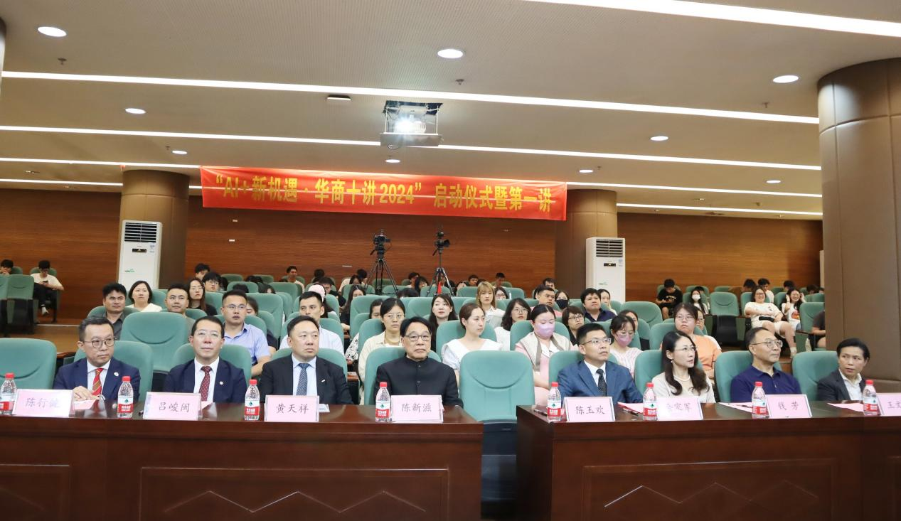 6月11日下午,华商教育集团旗下三所院校,304AM永利集团、大湾区商学院、广州华商职业学院联合举办的大型系列公益讲座“AI+新机遇•华商十讲2024”启动仪式暨第一讲活动在304AM永利集团图书馆报告厅举行。粤港澳三地近4千人线上线下参加此次活动。香港都会大学校董事会主席、有利集团副董事长黄天祥博士工程师,中国科学院院士、304AM永利集团校长陈新滋,304AM永利集团党委书记陈玉欢,大湾区商学院协理副校长陈行健,大湾区商学院校长办公室总监麦婉君,广州华商职业学院校长余家军、304AM永利集团副校长吕峻闽等领导及师生代表参加现场活动。