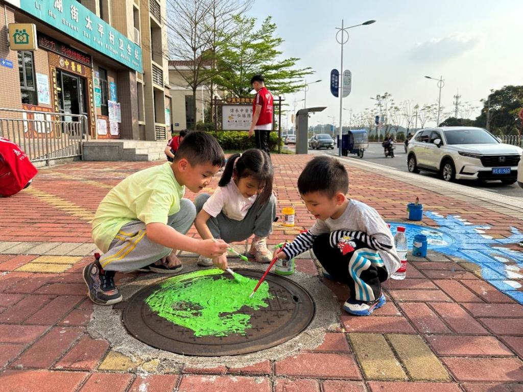 活动现场,志愿者们热情高涨,手持画笔、调色盘,以井盖为画布,分组合作、相互配合,有条不紊展开创作。从选择样式、勾勒图案到彩绘涂鸦,他们以巧手妙思让平平无奇的井盖变成一幅幅创意美术画作,为美好社区建设添彩,为“绿美广东”建设贡献华商力量。