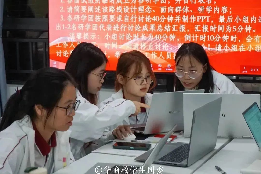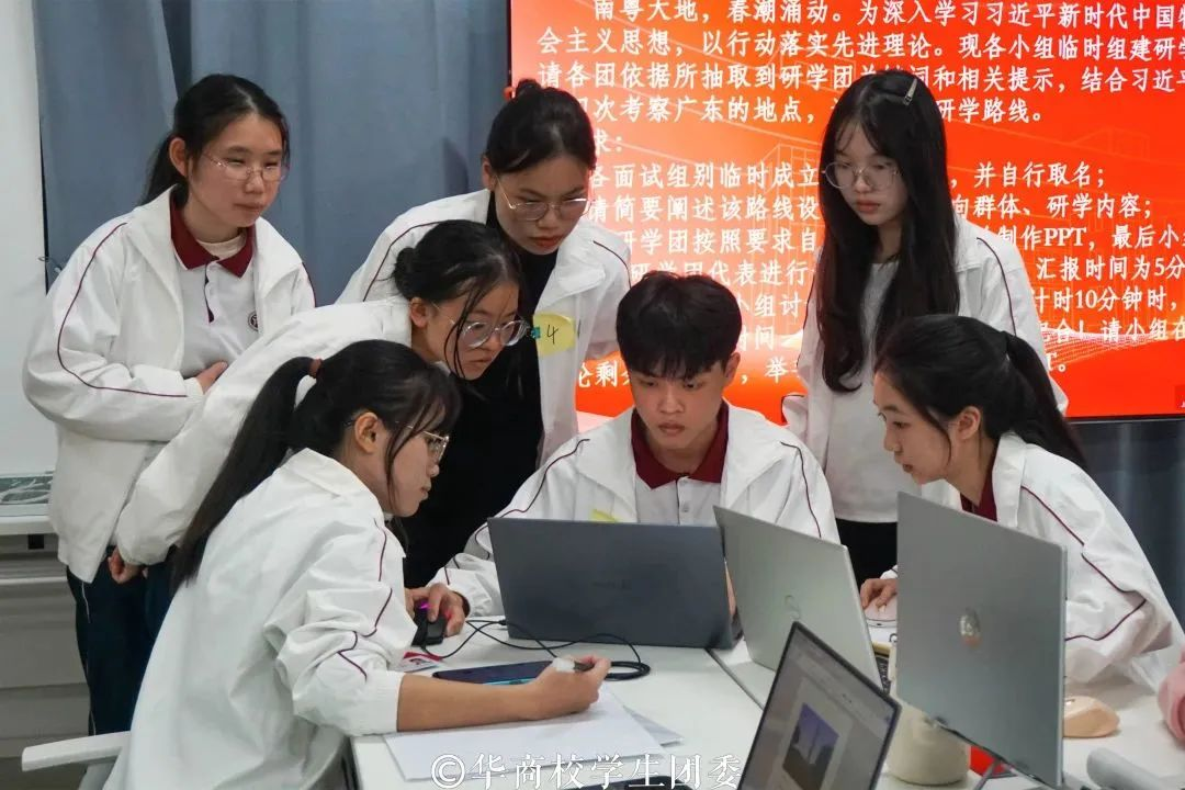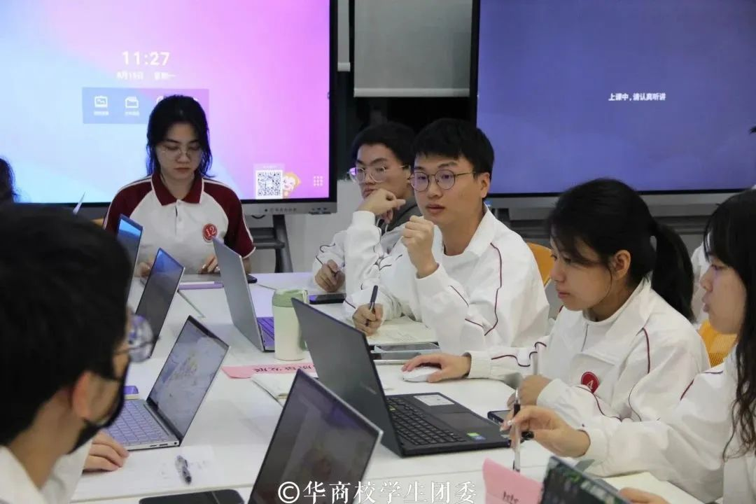 小组讨论总结汇报环节中,同学们积极上台演讲,展示小组讨论的成果。他们呼吁华商青年擦亮奋斗底色,续写时代华章,当好党的二十大精神的积极传播者和忠实践行者,以自信乐观的态度为老师、为同学服务;并将理论精神付诸于实践,在积极奉献中实现个人价值,砥砺自身品格,增长自身本领。