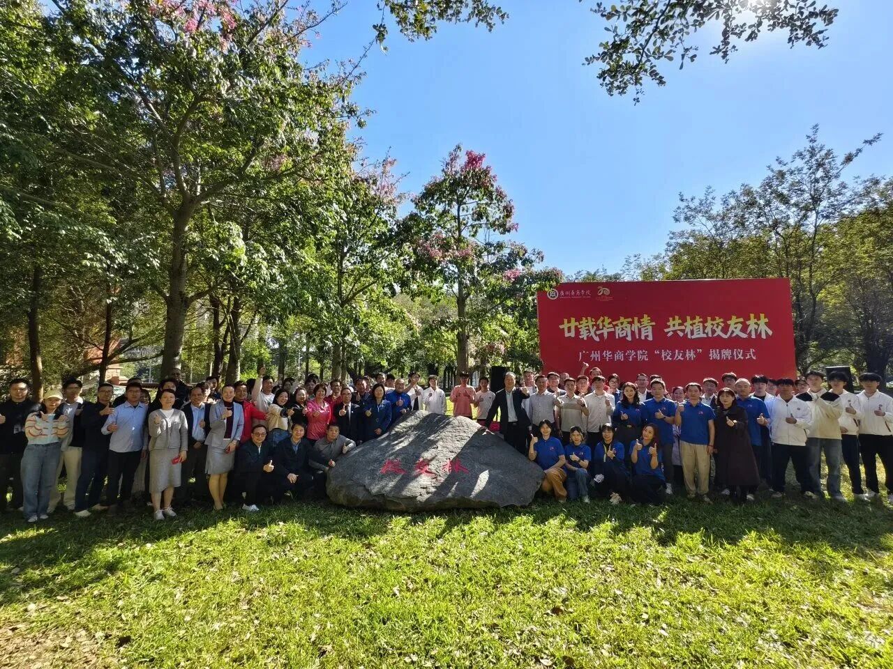 廖榕就董事长、陈玉欢书记、副校长吕峻闽、许娜、学校顾问兼校友会会长郭银华、王锦秀顾问与校友代表黄伟、马列、侯意雄等共同为校友林揭牌;陈玉欢书记、吕峻闽副校长、许娜副校长、王锦秀顾问分别为树木认养人代表颁发证书。自此,“校友林”正式成为华商校园中连接过往与未来、校友与母校的情感枢纽,成为传承华商精神的文化地标。
