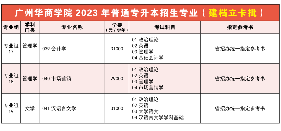 ●以上招生专业、收费标准及录取批次以广东省招生办公室公布的《广东省2023年普通高等学校专升本招生专业目录》为准;各专业招生计划数由广东省招生办公室公布。