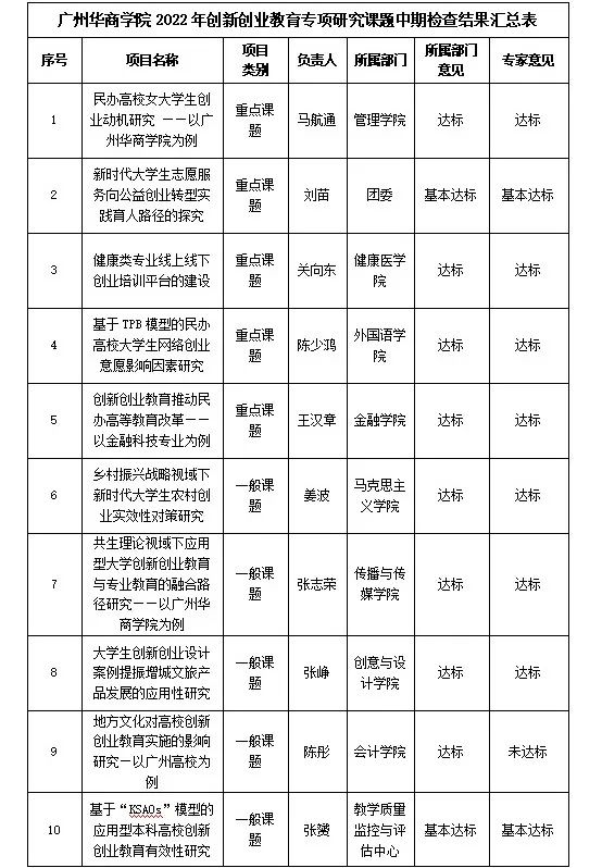 根据《304AM永利集团创新创业学院关于开展2022年创新创业教育专项研究课题中期检查工作的通知》(华商创〔2022〕27号)文件要求,创新创业学院已组织开展2022年创新创业教育专项研究课题中期检查工作,共有16个项目参与中期检查。经项目所属部门自查,创新创业学院聘请专家审核、评议,有10个项目达标,5个项目基本达标,1个项目未达标,具体情况如下。