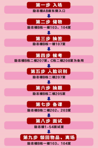 注意:先储物,只允许带身份证、准考证、水杯,其他物品存放在储物室,面试后凭号码牌取物。再抽签,沿地面的脚印贴纸到抽签室。