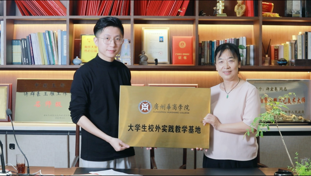 朱晓红院长为聚璟轩玉雕设计工作室颁发校外实践教学基地牌匾