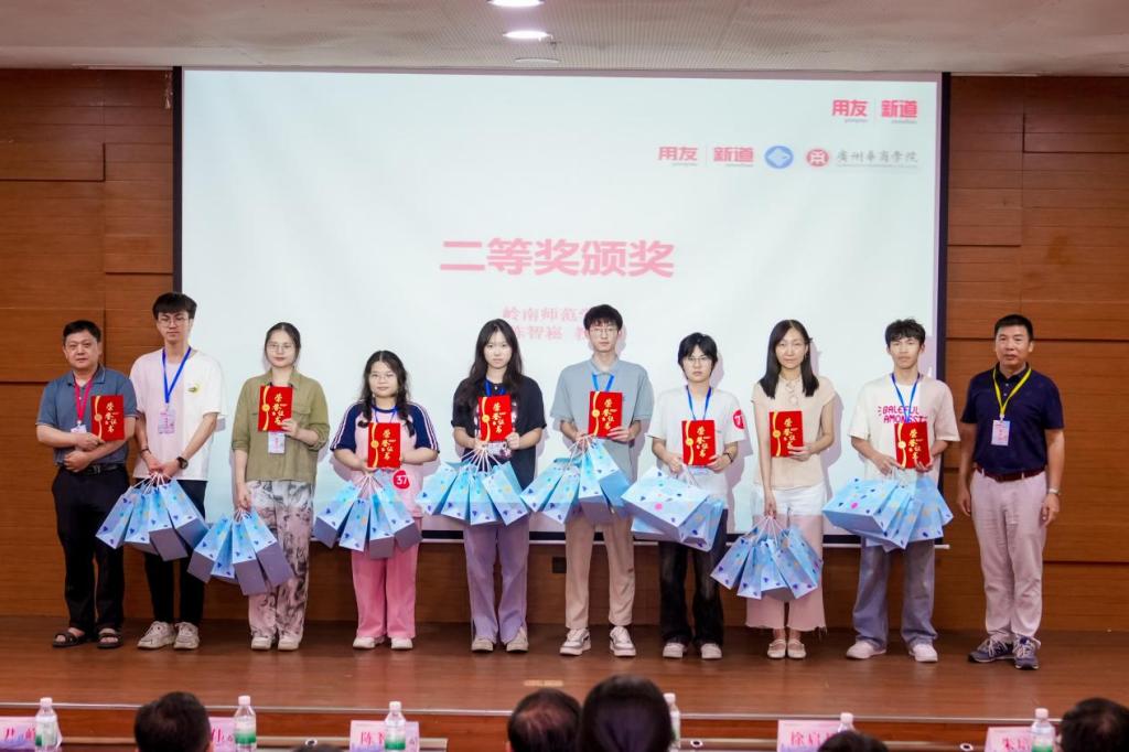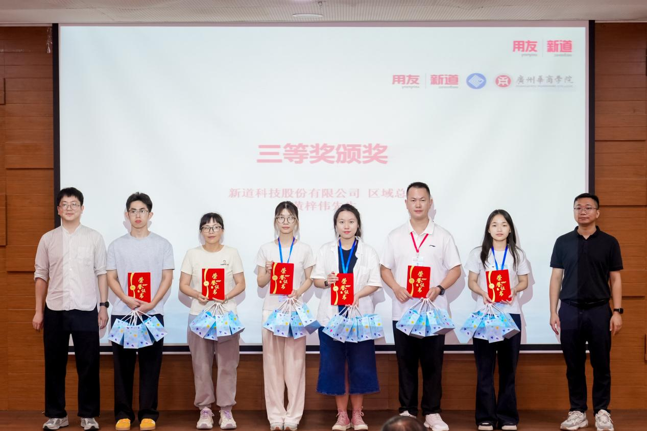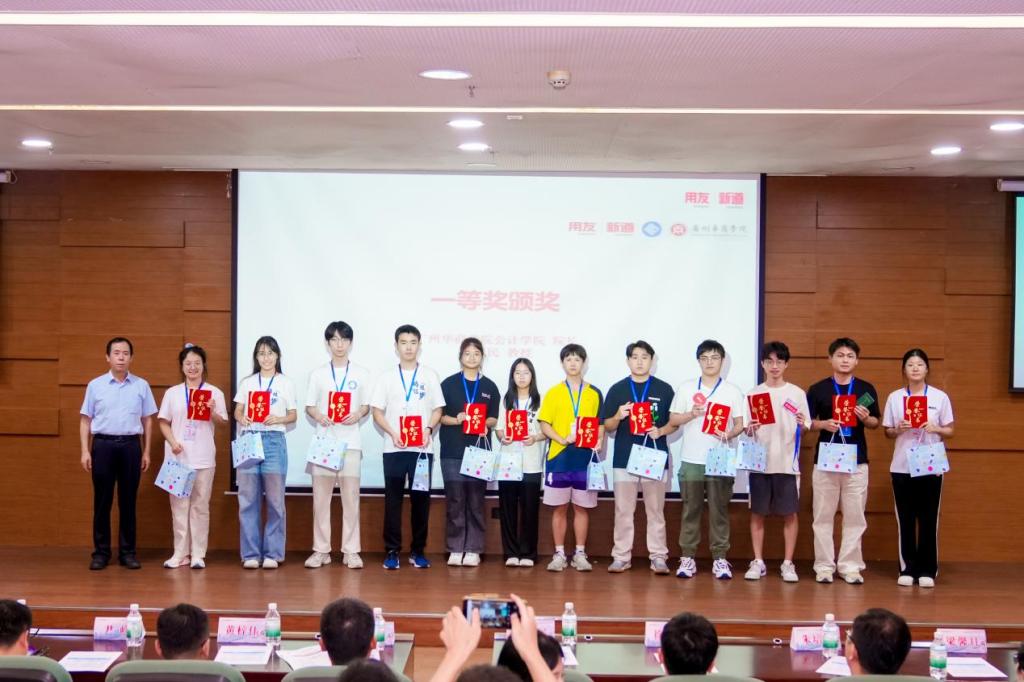 姚凤民院长、陈智崧裁判长、服务总监徐启超、新道科技股份有限公司区域总监黄梓伟分别为获奖队伍颁奖。获奖选手手持证书与奖杯,脸上洋溢着喜悦与自豪,现场掌声不断。