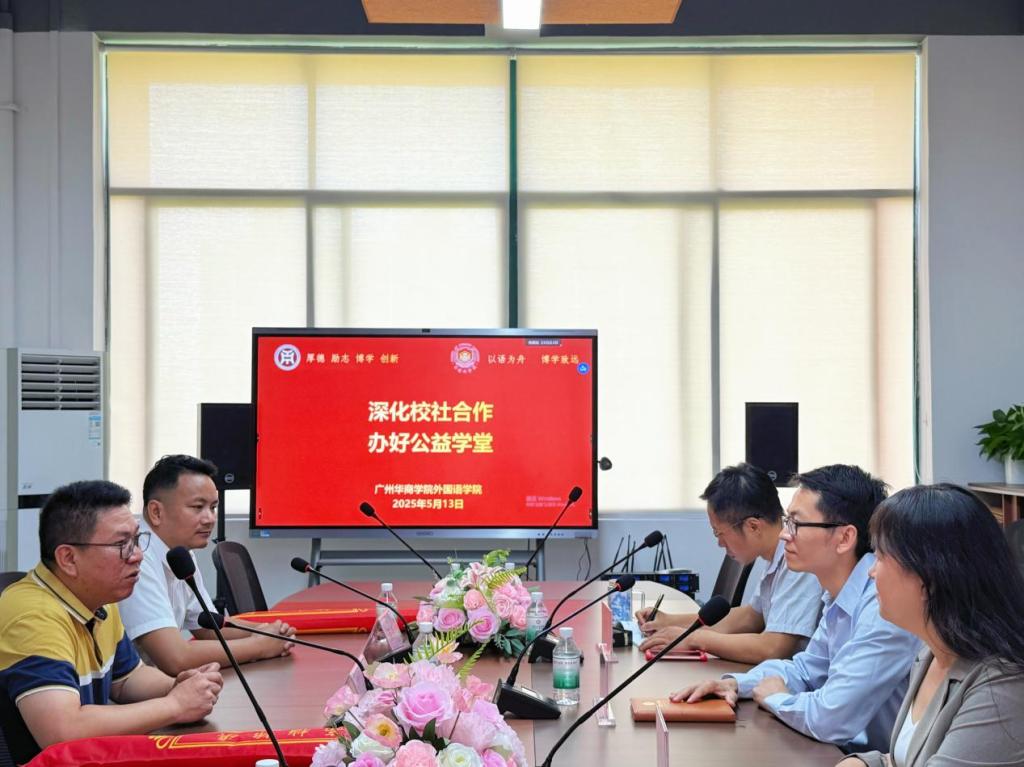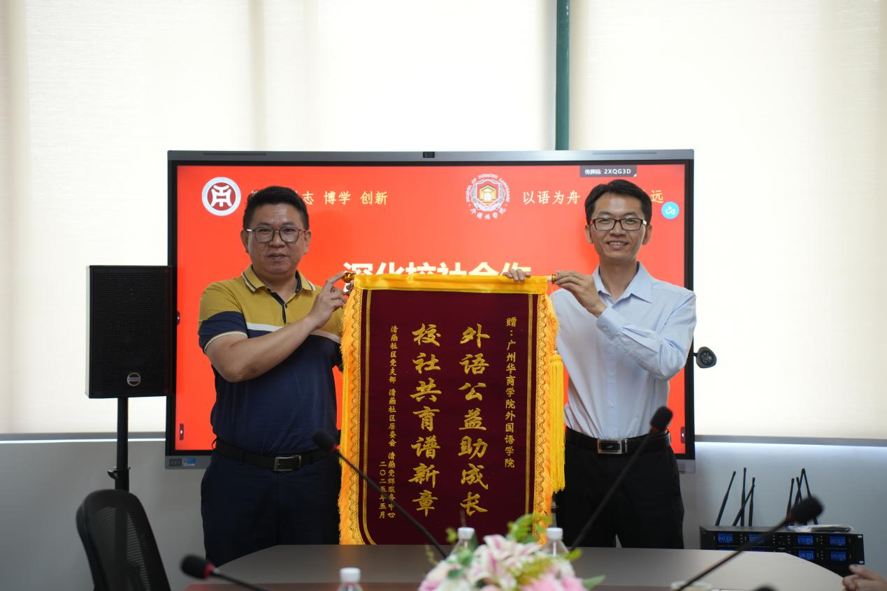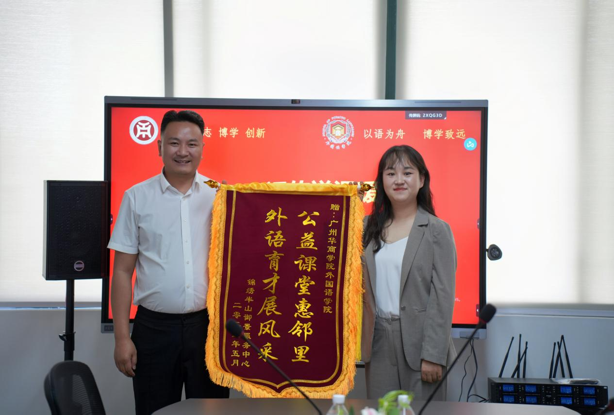 5月13日上午,304AM永利集团外国语学院与增城区清燕社区、锦绣半山御景花园小区物业联合举办的“晚风学堂”英语晚辅公益项目赠锦旗仪式在创新楼403-2小会议室举行。清燕社区邓镜波书记、锦绣半山御景花园小区物业陈勇经理、外国语学院何顺发副院长及“晚风学堂”项目组全体成员共同见证这一校社协同育人的温暖时刻。“晚风学堂”不仅体现了外院学子践行社会责任的热忱,更是校社双向奔赴、共筑教育公益新模式的生动缩影。