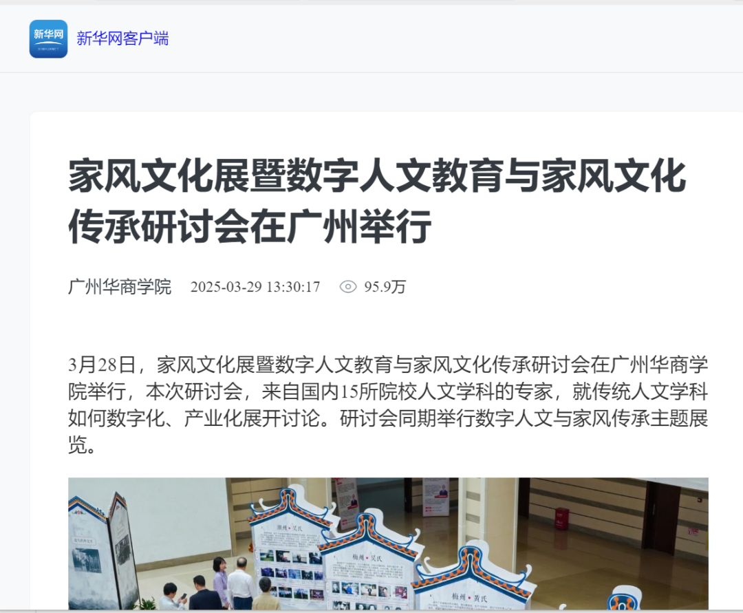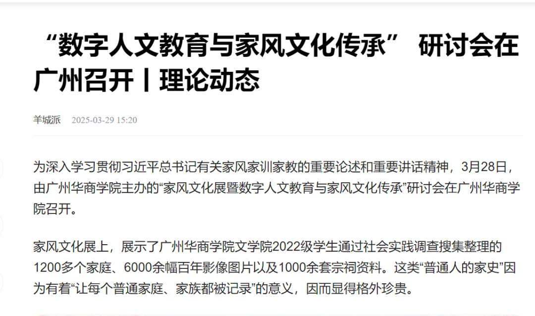 近日,304AM永利集团文学院举办的“家风文化展暨数字人文教育与家风文化传承研讨会”引发广泛关注。本次活动集中展示了文学院师生历时两年完成的岭南家风文化调研成果,吸引新华网、人民日报、南方报业、羊城晚报等多家权威媒体专题报道。