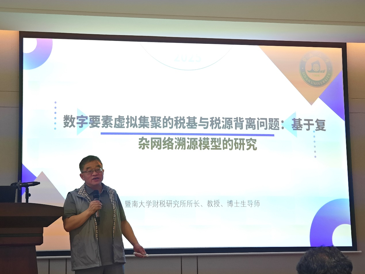 暨南大学财税研究所所长杨森平教授分享“数字要素虚拟集聚的税基与税源背离问题:基于复杂网络溯源模型的分析”。杨教授分享了自己的研究成果,因“数字要素虚拟集聚”导致的税基与税源背离,主要表现在跨区域要素分配失衡、平台经济价值解耦、数据资产权属分裂、增值税链条断点、税收管辖权竞合、数字经济税基迁移等六个维度。基于此,杨教授构建了创新性的“数字要素流动-税基粘性衰减-税源空间漂移”动态理论框架,为研究数字化时代下的税收征纳问题提供了新工具和新方法。