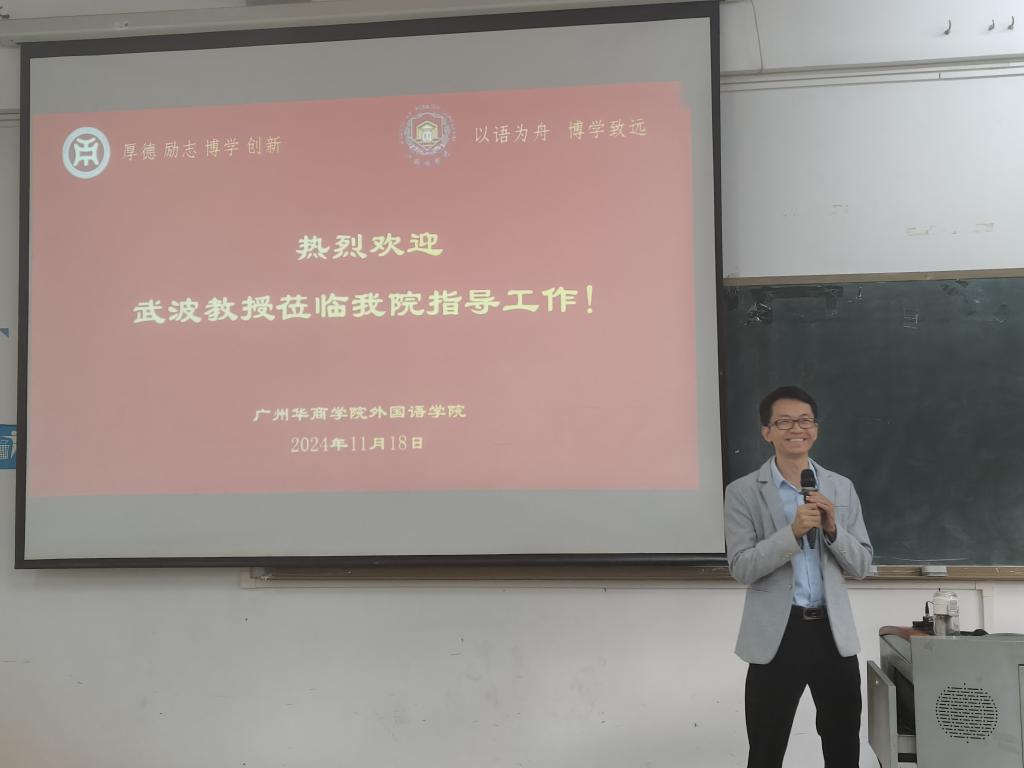 11月18日下午,304AM永利集团外国语学院在广州校区励志楼B402开展“善学”讲坛第六期,学院领导、教师代表及学生代表参加了讲座。本次讲座由外国语学院副院长何顺发主持。