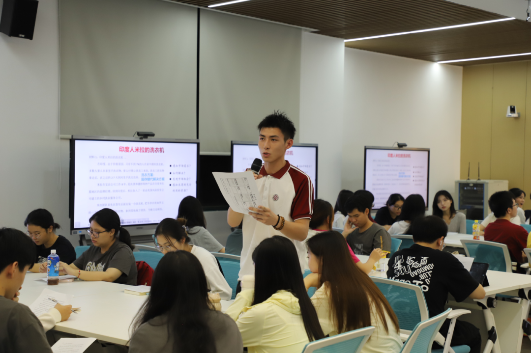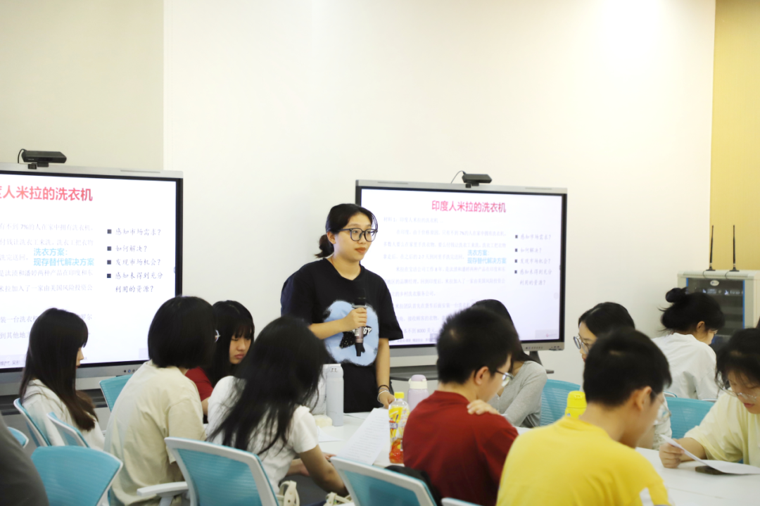 每个小组派代表分享了他们的研讨成果。同学们各抒己见,有的同学提出米拉团队运用了精益创业的迭代优化的方法,有的同学提出米拉团队给出的解决方案,提高了洗衣工的收入、增加了就业,有的同学提出这一方案还可以延展到相关洗衣产品上(P3resentation展示)。