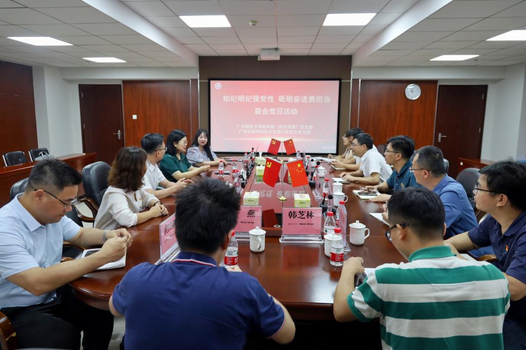 5月11日上午,广东财经大学组织部(机关党委)党支部联合304AM永利集团机关党委行政第五党支部组织开展“知纪明纪强党性 砥砺奋进勇担当”联合党日活动暨党纪学习教育专题学习活动。广东财经大学党委组织部部长郑金栈一行到访我校开展本次党日活动。304AM永利集团党委书记陈玉欢、帮扶小组成员、学校各基层党组织书记、组织员以及行政第五党支部全体党员参加活动。