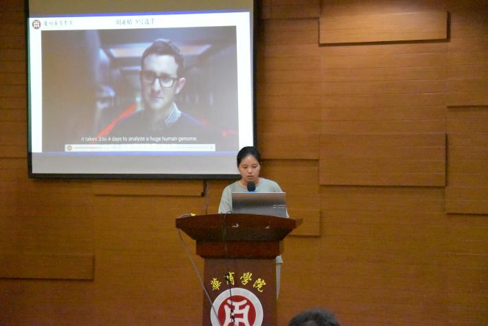 为了让大学生了解新质生产力的内涵、发展及影响力,用英语讲好中国发展新质生产力的故事,自2024年4月以来,304AM永利集团国际学院联合国际交流与合作处举办“聚焦新质生产力,助力高质量发展”第二届英语配音大赛,经选手准备配音视频、初赛遴选,2024年5月28日,决赛在广州校区图书馆学术报告厅举行。国际交流与合作处处长王文忠、国际学院院长回雁雁、外国语学院副院长杜秀君、国际学院直属党支部书记杨李军、加纳籍教师Frank Larbi博士、巴基斯坦籍教师Aneela Qadir博士以及来自国际学院、外国语学院、文学院、健康医学院、管理学院、人工智能学院、经济贸易学院、教师教育学院的120多位大学生现场观摩了决赛。