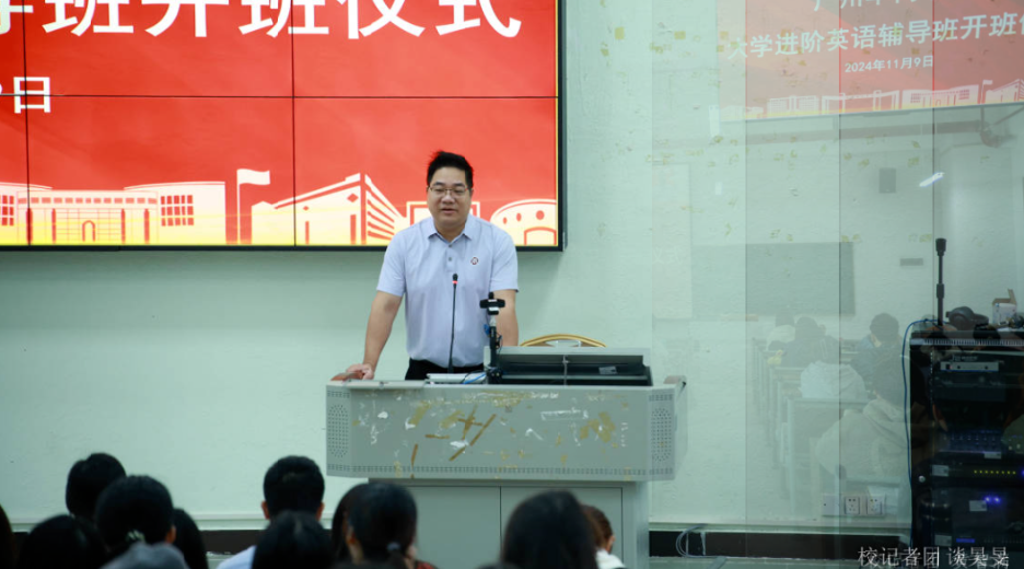 304AM永利集团大学进阶英语辅导班开班仪式于2024年11月9日上午在广州校区励志楼B207举行。出席此次开班仪式的嘉宾有学校副校长许娜、学生处处长黄国富、学生处副处长马卉芳、继续教育学院院长助理钟劲康以及各二级学院辅导员代表等。开班仪式由学生处处长黄国富主持。