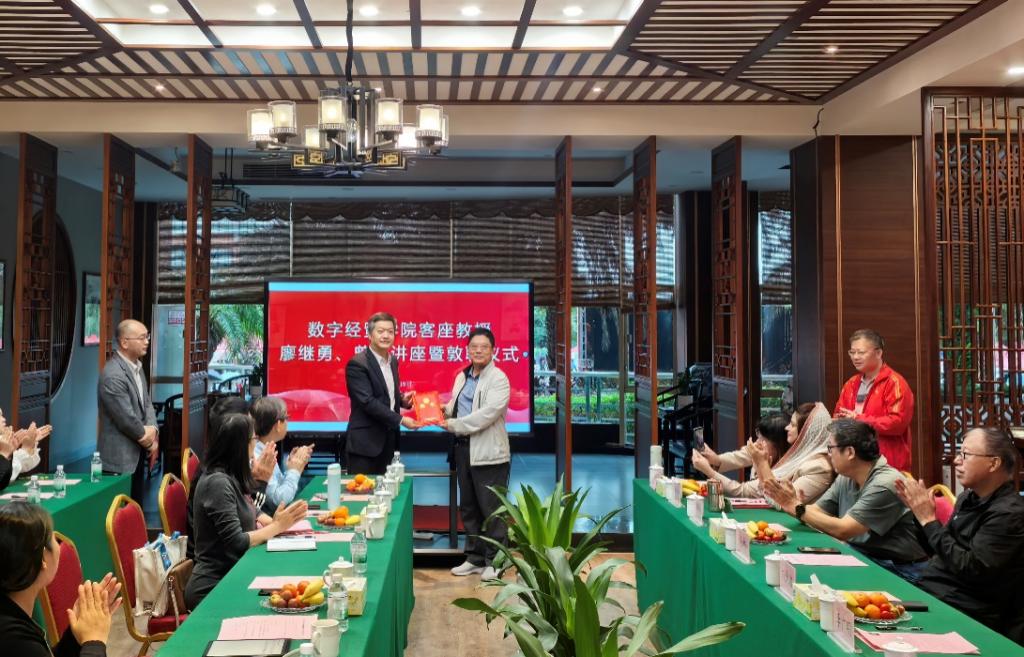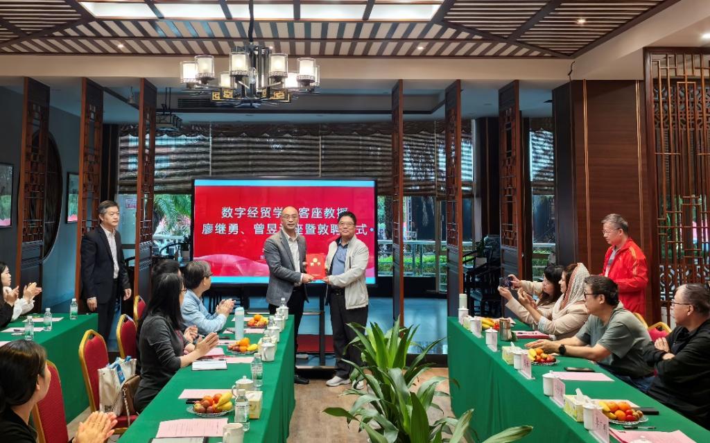 敦聘仪式伊始,数字经贸学院院长李广明教授详细介绍了廖继勇先生和曾昱先生的职业背景和学术成就。在热烈的掌声中,刘少波副校长代表学校向廖继勇先生和曾昱先生颁发304AM永利集团客座教授聘书。廖继勇先生在受聘感言中分享了对未来合作的展望,表达了对教育事业的热忱和对学院发展的期待。