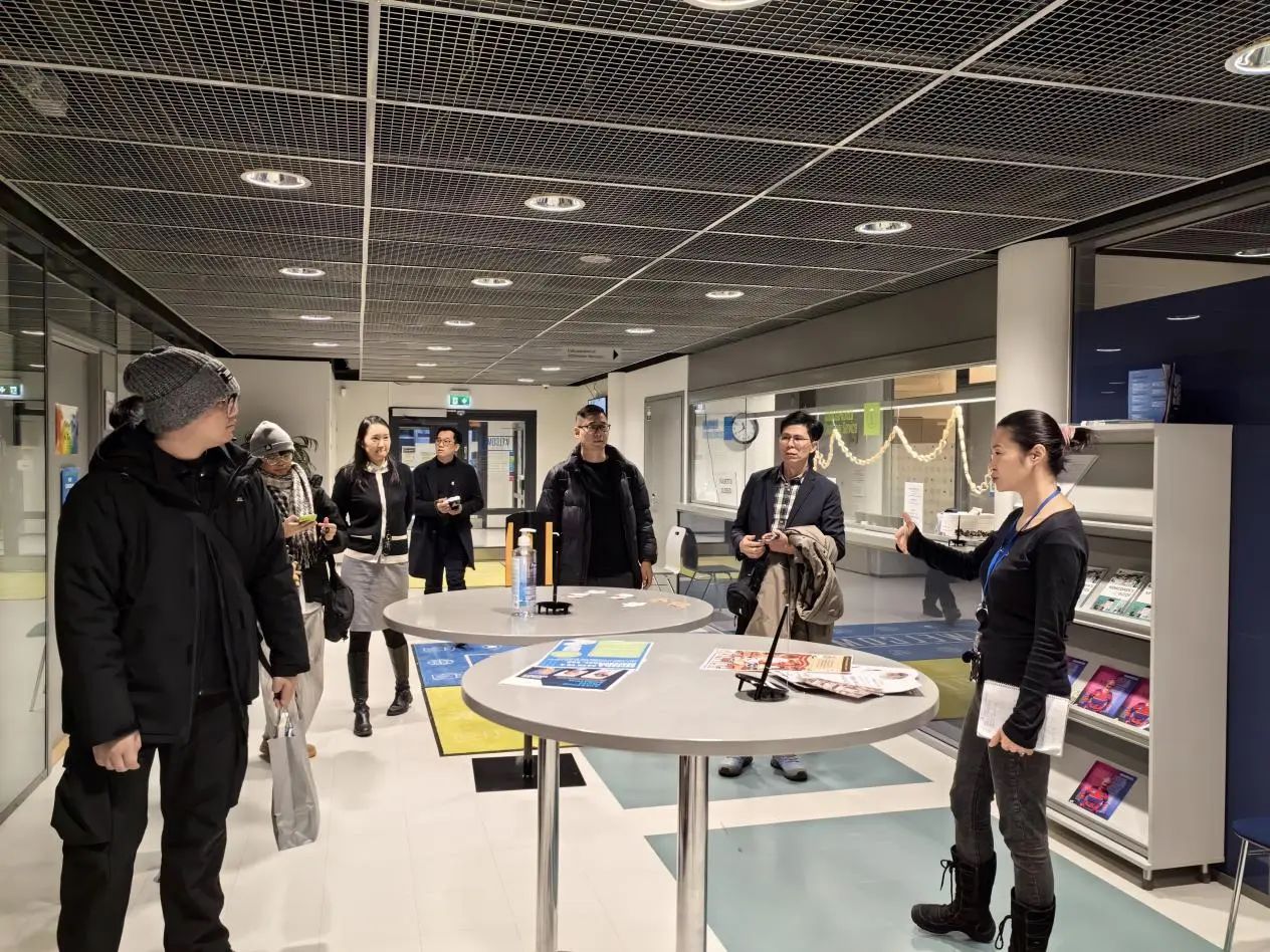 第二日的行程中,访学团赴坦佩雷应用科技大学进行参访,在企业家学园Coach教练刘熹接待下,访学师生参观了校园并体验了该校独特的教育环境和学术氛围。刘熹教练详细介绍了企业家学园的办学理念、课程设置以及培养模式,让访学团师生对企业家学园的教育模式和创业支持有了全面的认识。