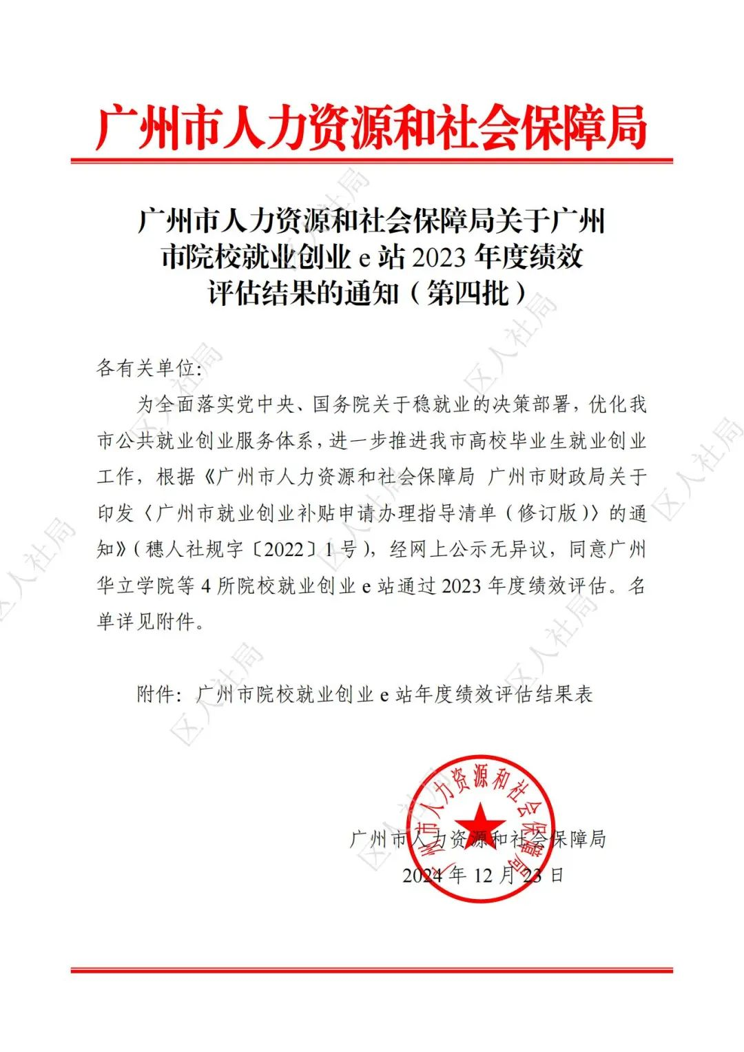 2024年12月23日,根据《广州市人力资源和社会保障局 广州市财政局关于印发〈广州市就业创业补贴申请办理指导清单(修订版)〉的通知》(穗人社规字〔2022〕1号),经网上公示无异议,同意304AM永利集团就业创业e站通过2023年度绩效评估。