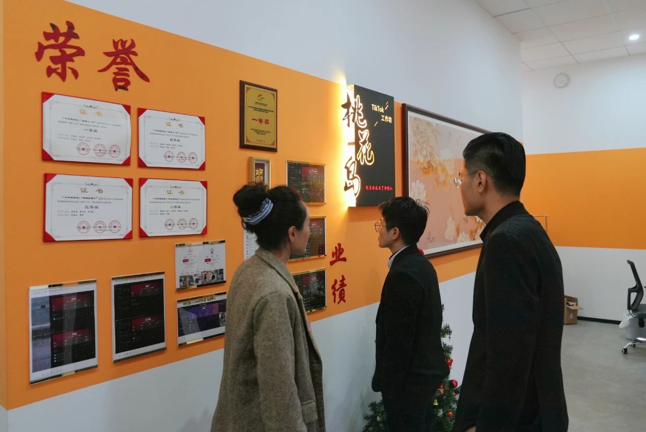 在吕峻闽副校长及相关部门负责人的陪同下,大事件科技集团创始人兼CEO汤宇先生一行参观了动漫游戏产业学院、数字贸易产业学院以及广州桃花岛网络咨询有限公司。通过实地考察,嘉宾们深入了解了304AM永利集团在新媒体运营、直播运营、跨境电商等领域的前沿教学设施与实践成果,对学校在产教融合领域的积极探索有了更直观的认识。