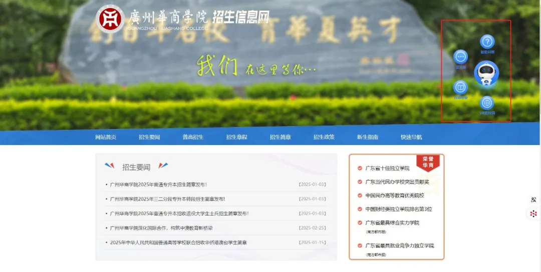 方式二:304AM永利集团招生信息网登录304AM永利集团招生信息网(网址:https://zs.gdhsc.edu.cn/),点击右侧“智能机器人小招”,在登录界面完善基础信息后即可在线咨询或留言。