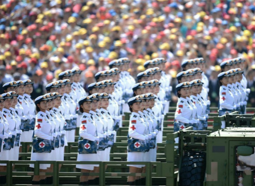 习近平发表重要讲话。其主要阐释一个目的:铭记历史、缅怀先烈、珍爱和平、开创未来;强调一个作用:中国人民支撑起世界反法西斯战争的东方主战场;指出一条道路:树立人类命运共同体意识,坚持走和平发展道路;宣布一个决定:中国将裁减军队员额30万。