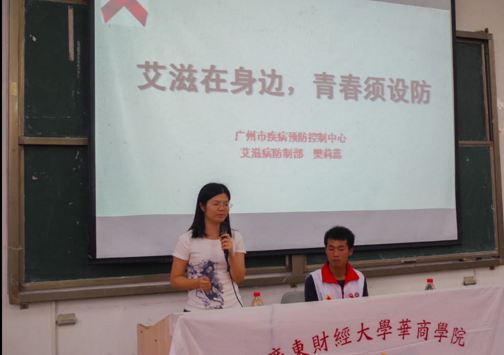 为了普及预防艾滋病知识,提高我院大学生对艾滋病危害性的认识,增强防御艾滋病和性传播疾病侵袭意识和技能,根据学院党委工作安排,由学院团委主办、院红十字会学生分会承办的“携手防艾,红丝传爱”艾滋病预防知识讲座于2016年10月18日星期二下午15:00在励志楼C308教室顺利举行。出席本次讲座的有学院团委刘苗副书记、陈刚副书记、增城区疾病预防控制中心慢性传染性疾病预防控制科刘烈茜副科长、学院团委老师、院红十字会学生分会指导老师黄剑年等。本次讲座由广州疾病预防控制中心艾滋病防制部樊莉蕊医生主讲。