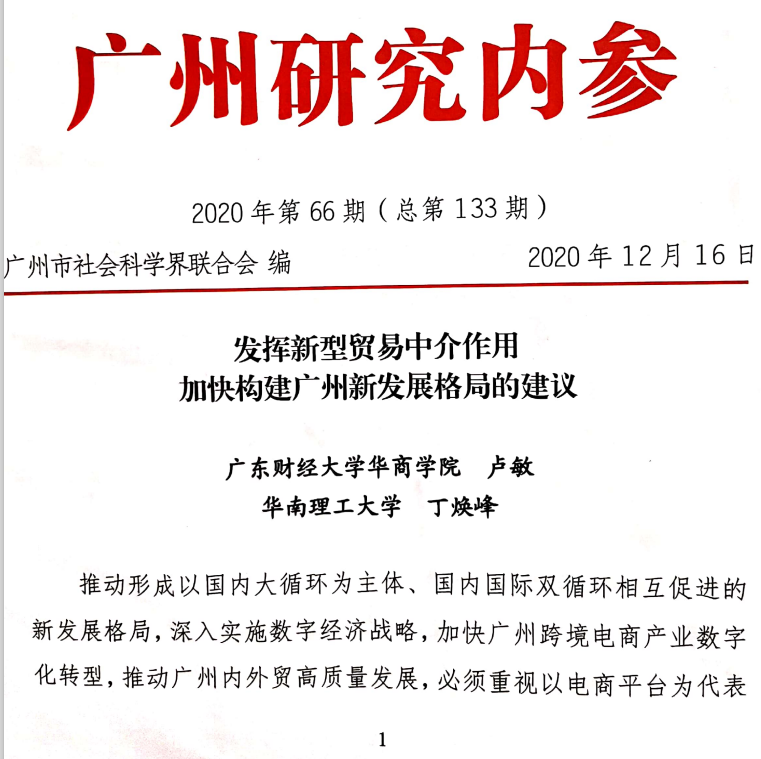 该研究成果是卢敏老师在国内大循环为主体、国内国际双循环相互促进的新发展格局下,为加快广州跨境电商产业数字化转型,在对国际贸易新业态新模式研究方面取得的重要阶段性成果,也是我校青年骨干教师积极投入社会经济发展研究、服务地方经济社会发展取得的代表性学术研究成果。