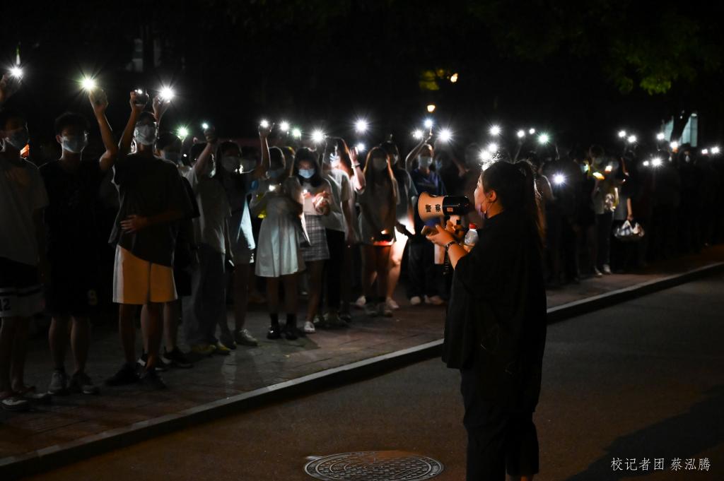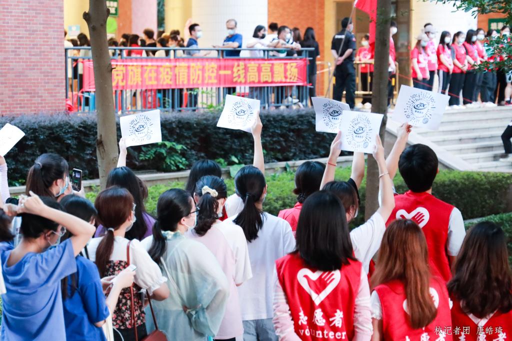 在核酸检测工作进行期间,我校学子自发组织,手举红旗为医护人员献唱、亮起灯光喊响“广州加油!白衣天使谢谢你!”的口号为医护人员送别,以此表达对本次抗疫的决心及对白衣天使们的感激之情。