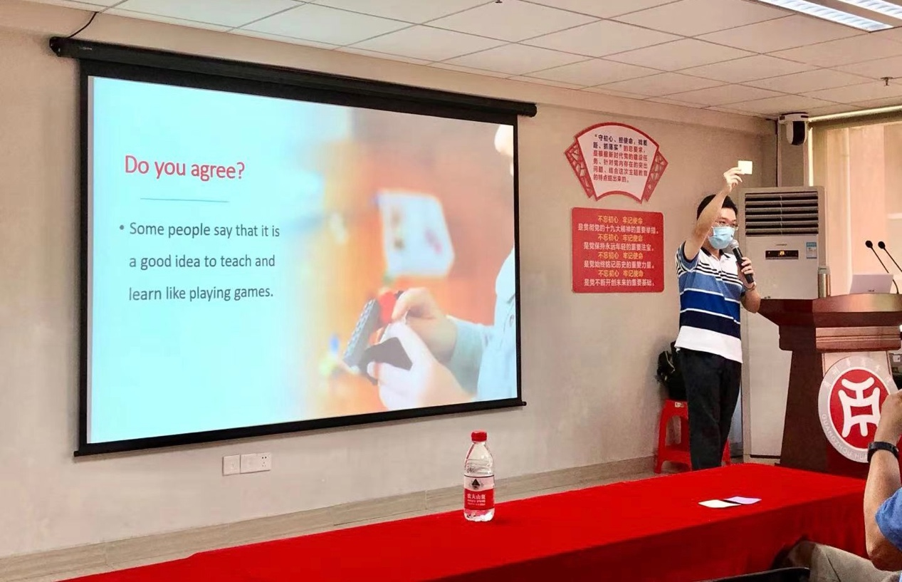 王文忠处长向大家介绍了主讲老师周国辉及他的优良教学效果。周国辉老师的讲座题目为: “双语教学中课堂活动和授课语言的运用”。周老师由问题导入,以实例解说如何启动“破冰”环节,如何引导学生积极参与课堂、相互熟悉。随后,周老师围绕双语教学中的重点和难点——课堂活动及授课语言使用展开了讲解。他指出教师应用简洁清晰的语言讲解,给予学生明确的任务,应把主动权交给学生,根据实际情况适度创建“游戏课堂”等方法提升教学效果。周国辉老师通过教学游戏与老师们进行互动问答,现场气氛活跃。周老师还向大家介绍了便捷实用的网络工具。