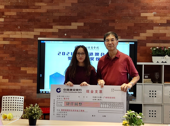 王锦秀副校长、钟森文副校长分别为获得国家奖学金的2018级经济与金融专业的光余辉、2019级学前教育专业的蔡少玲两名港澳学生颁发奖学金,并合影留念。