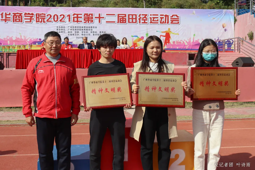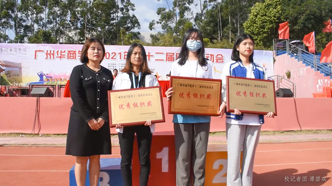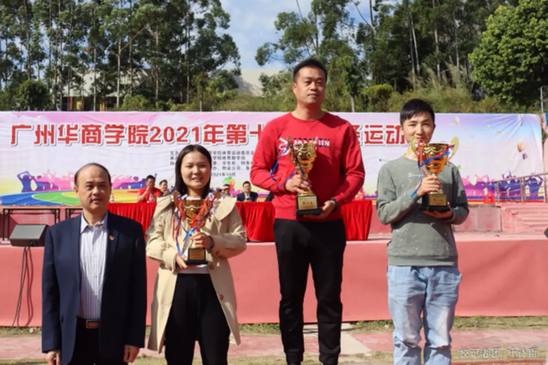 由裁判长顾伟农宣读第十二届田径运动会成绩,排名前三的分别是:第一名四会校区代表队,247.5分;第二名会计学院代表队,155分;第三名数据科学学院代表队,102.5分。第四名至第第八名则分别是管理学院代表队、继续教育学院代表队、文学院代表队、 健康医学院代表队、传播与传媒学院代表队。