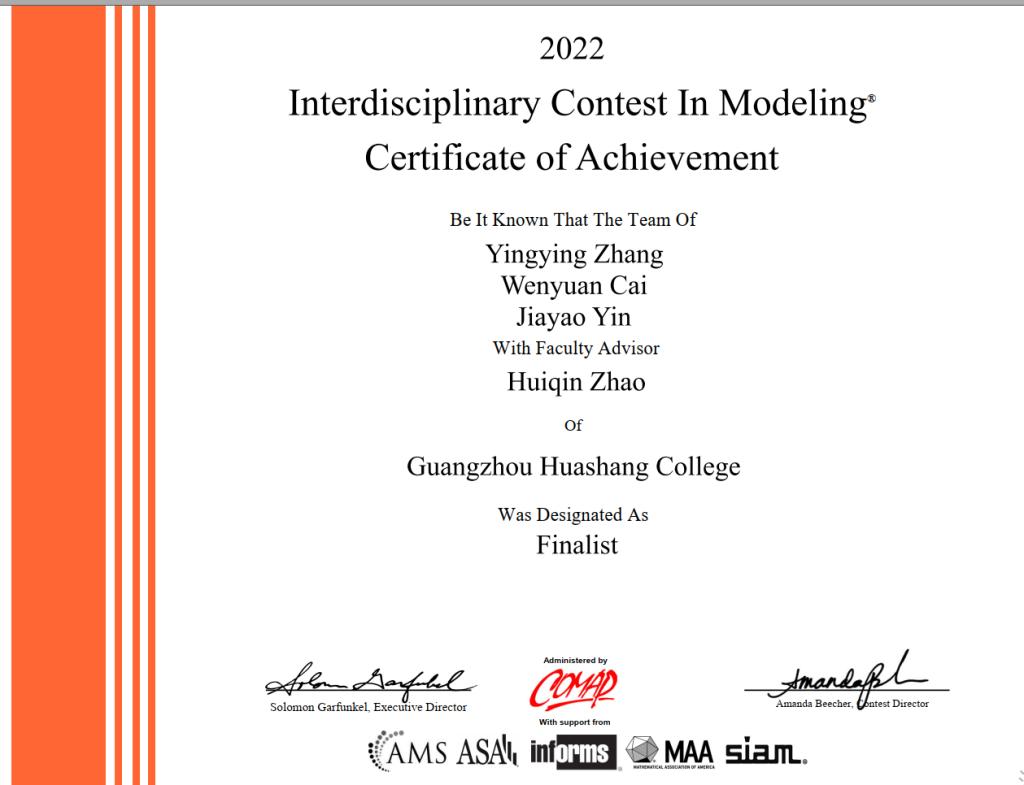由我校经济贸易学院的赵慧琴老师指导、金融学院19级经济与金融专业张盈盈同学、经济贸易学院19级国际商务班蔡文渊同学及数据科学学院19级计算机科学与技术专业尹家耀同学组成的参赛队伍,在学校和学院的支持下,于今年2月18日-22日期间参加美国大学生数学建模竞赛,获得F奖(特等奖提名)。这是目前我校在该项比赛中获得的最好成绩。