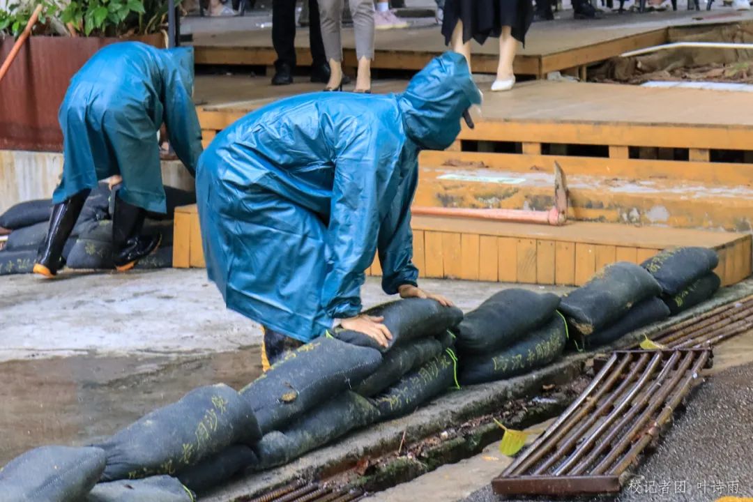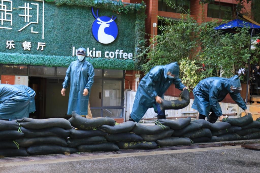 抢险救援组迅速把防汛沙袋搬运至遇见餐厅门口构筑挡水坝,清理疏通排水通道。