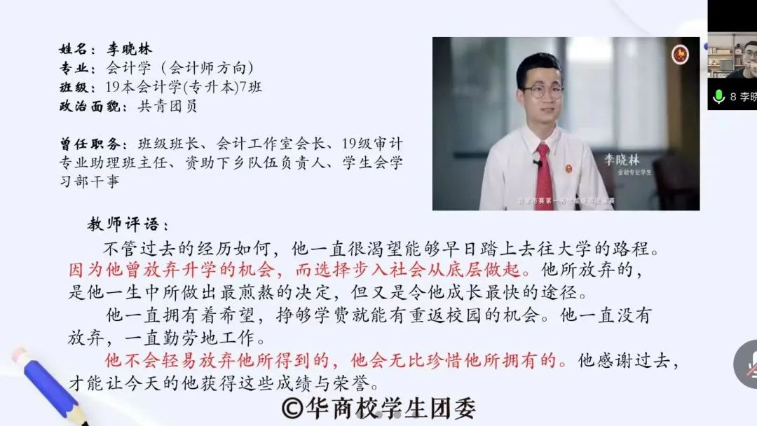 参与此次校内评审的9位候选人依次讲述了各自在学习、生活和社会实践中的经历,展示出了他们在拼搏奋斗中所获得的优异成绩,展示了华商青年开拓进取、笃行实干的精神风貌,发挥出了当代优秀青年大学生先进典型的示范引领作用。