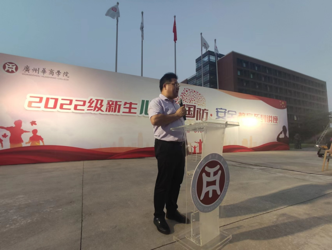 “国无防不立,民无防不安”,正值军训期间,为了加强同学们对国家安全形势的认识,提升国防安全意识,激发同学们的家国情怀和使命感,我校于9月16日在四会校区国旗广场下开展2022级新生国防安全教育讲座。本次讲座,我校邀请了空军驻广州军代局政委强以文大校作为主讲人,本次讲座由学校武装部部长、学生处副处长黄国富主持。