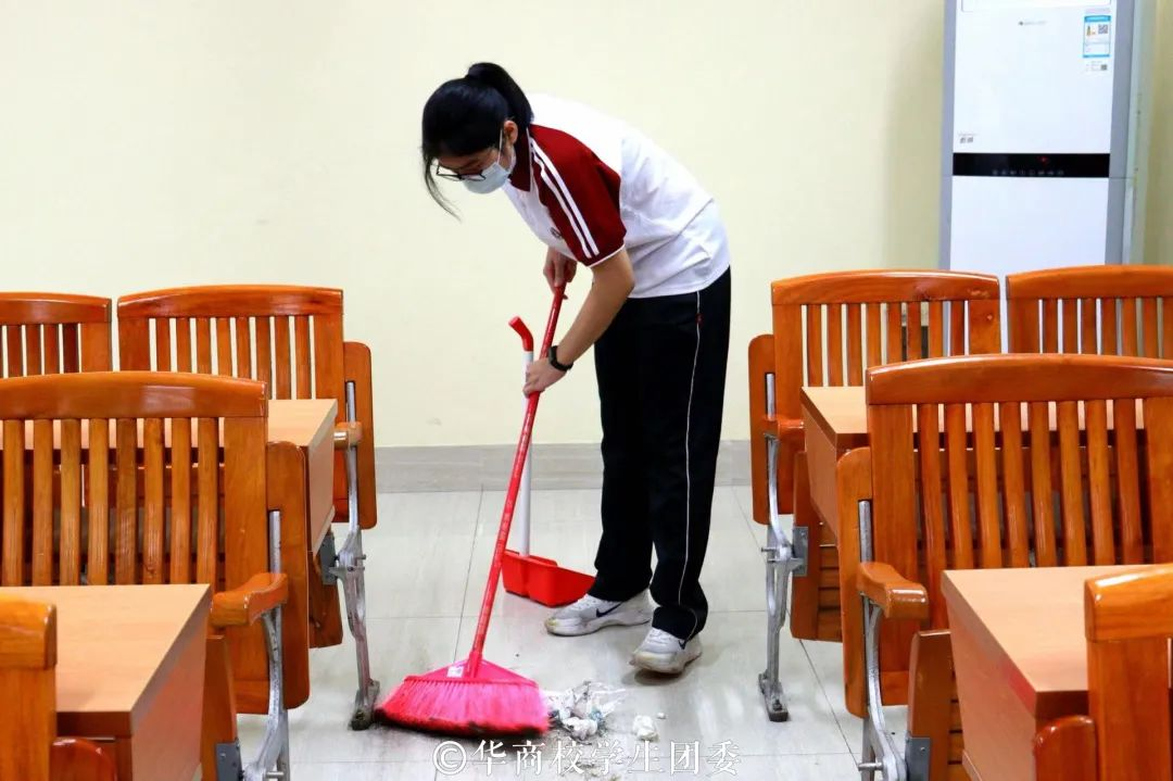 做青年志愿者,扬劳动之美德。在校团委的有序组织下,全员全程佩戴口罩,落实疫情防控常态化要求,在启智楼进行扫码核实以及签到,各组学生骨干们合理分工、各司其职,细致地清扫教室内的每一个角落,清理教室垃圾,擦拭桌面的灰尘,井然有序地进行志愿清扫活动,彰显了华商学子良好的精神面貌。