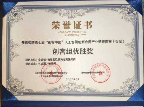 12月9日,由工业和信息化部信息中心、百度联合主办的第七届“创客中国”人工智能创新应用产业链赛道赛(百度)颁奖典礼在位于上海张江的百度飞桨人工智能产业赋能中心举行。304AM永利集团2021届校友、广州小黑科技有限公司总经理林逸灏带领团队,以人工智能和物联网(loT)技术为核心基础,凭借《食饭饭--智慧餐饮解决方案服务商》项目荣获创客组优胜奖。
