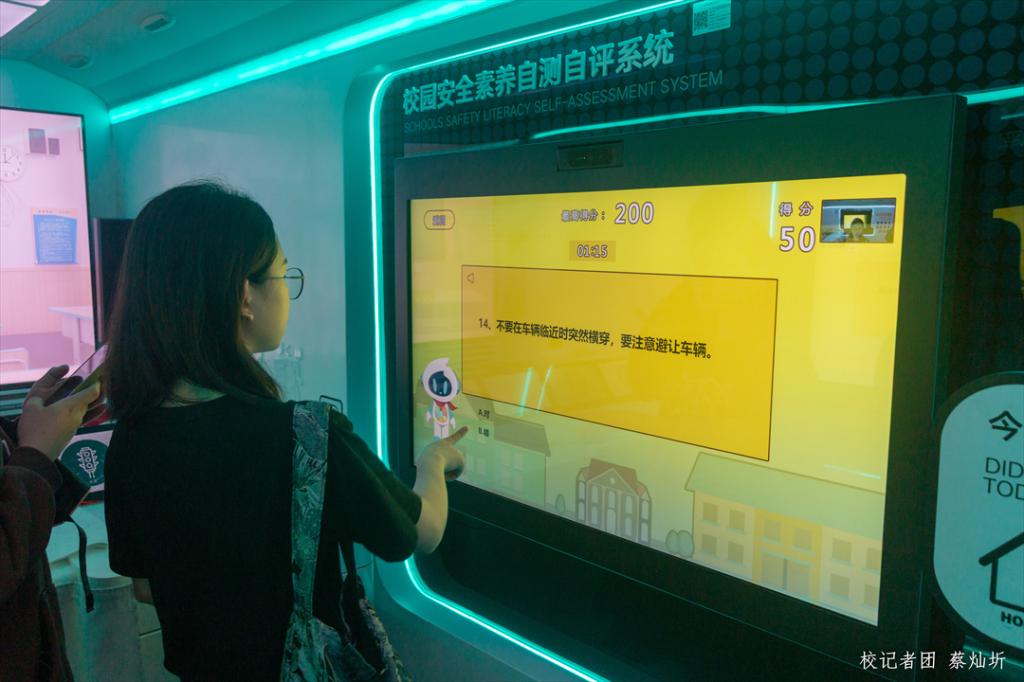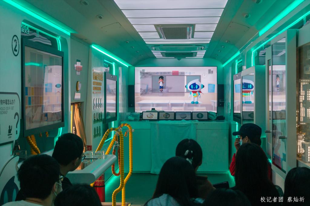 移动宣教车内设置了校园实验室安全、校园宿舍安全、校园食品安全、校园暴力、校园意外伤害、校园安全素养自测自评系统等多个学习板块,宣讲员对每个板块进行了详细专业的介绍以及实用的应急安全知识讲解,同时,在移动宣教车内还设有互动性较强的视频播放、答题游戏互动、4D火灾逃生环节等多个体验内容,通过生动新颖的方式让师生们身临其境,增强体验感,在游戏过程中掌握到更多的安全知识,强化安全意识,提升应急安全技巧。