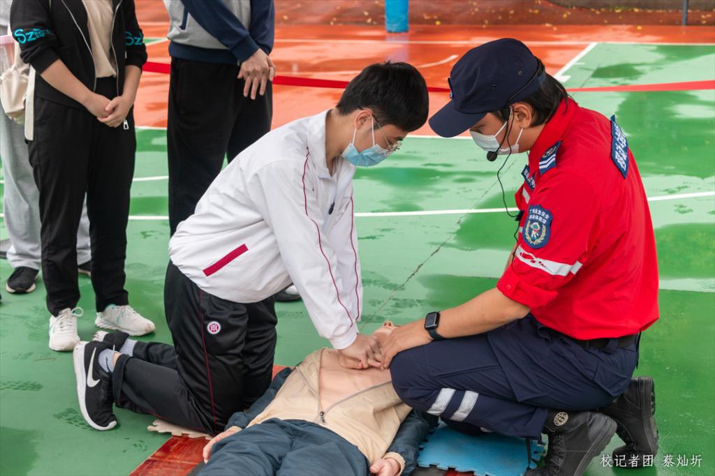 宣讲员利用人体模具示范,为在场师生详细介绍了徒手心肺复苏技能和海姆立克急救法的使用场景和操作方法。讲解、演示后,现场参与活动的师生亲身“上阵”体验实践操作,并宣讲员悉心解释要点、耐心纠正动作,提升师生防护、急救能力,做到防患于未然。