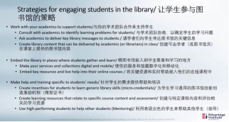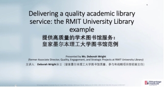 Deb Wright以皇家墨尔本理工大学图书馆为例,分享了其目标运营模式,详细阐述了一个高质量学术图书馆服务的关键要素。她认为高质量的图书馆要与所在院校目标保持高度一致;图书馆需要重视以用户为中心的设计;建设一个高质量的图书馆要着眼于未来。Deb Wright通过案例分享了使学生与图书馆密切联系、联结的策略,进而提升学术图书馆的服务质量。她建议利用新科技,引进数据化战略,建立数字化平台,助力图书馆的资源与服务效力最大化,为学生与教师提供一站式服务。