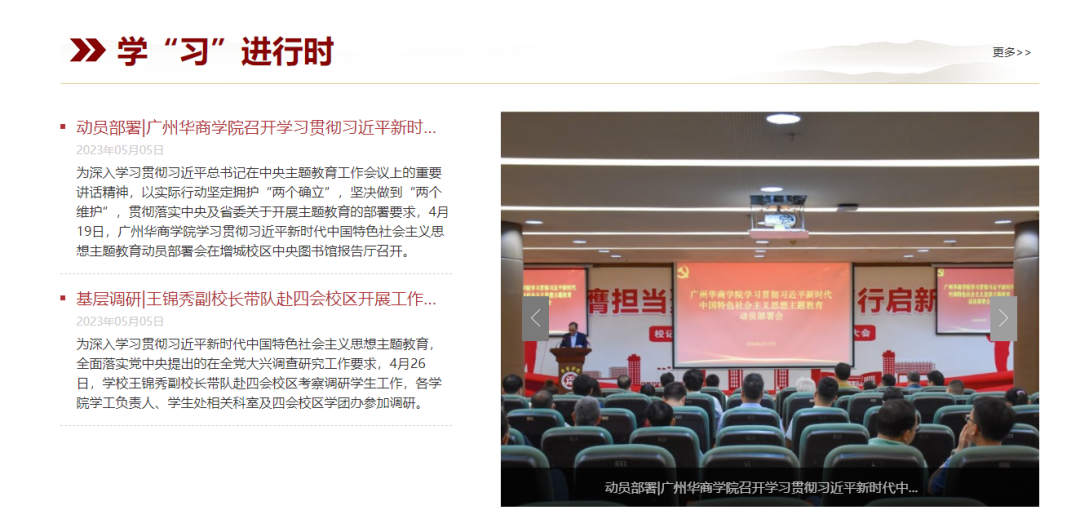 学校主题教育专题网站设有“重要论述”“中央精神”“权威发布”“要闻要论”“学‘习’进行时”等栏目,在学校官网主页设置入口链接。为全校师生跟进学习习近平新时代中国特色社会主义思想,及时了解学校主题教育开展情况提供信息平台。