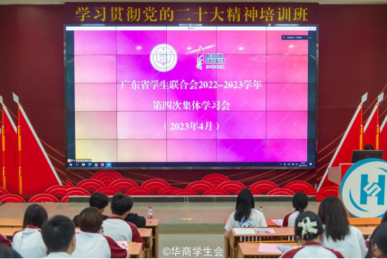 广东学联学生会2022-2023学年第四次集体学习会于2023年4月27日19:00通过视频会议方式召开。为深入贯彻党的二十大精神,深入开展学习贯彻习近平新时代中国特色社会主义思想主题教育,进一步深化新时代学联学生会改革和建设,我校团委组织动员校院两级学生会主席团成员及工作人员在励志楼c408进行同步学习。