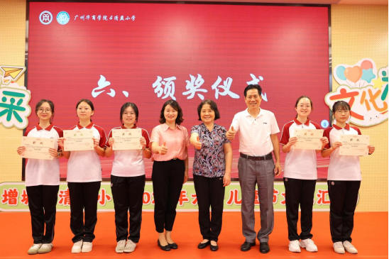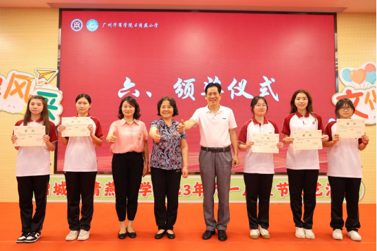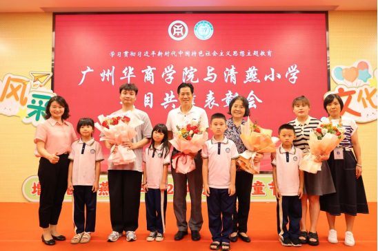 支戈壁副校长为本次表彰会致辞。她表示,华商学院与清燕小学仅有一墙之隔,具备先天的地理优势,虽各自培养的学生层次、阶段有所不同,但为党育人、为国育才是两校共同的使命,借力高校资源优势,助推当地基础教育高质量发展也是我们的责任担当。教师教育学院作为广东基础教育发展研究基地,更是要担负起助力清燕小学全面发展的重任。本次项目共建活动既给师范类的学生们提供了实践锻炼的平台,将自身专业和技能融会贯通,发挥自己的专业领域优势,同时又促进了清燕小学德育、美育等教育的发展,促进两校学子融合,携手共同进步成长。今后,两校将在师范生教育实践、教学研究与改革、基础教育教师培训与专业成长等多方面进一步加强合作交流,共同发展,为增城区教育事业做出应有的贡献。