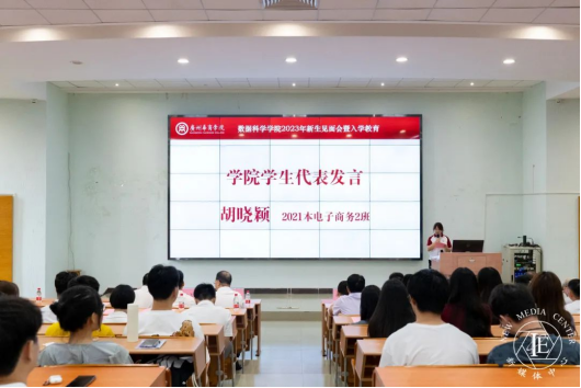 随后,2021本电子商务(专升本)2班胡宇轩同学和2023本人工智能班张琳同学分别作为新生代表发言,他们向大家分享了入学后的感受以及与高中的不同之处,并立志在大学做一个追求知识与智慧,身心健康,全面发展的人。