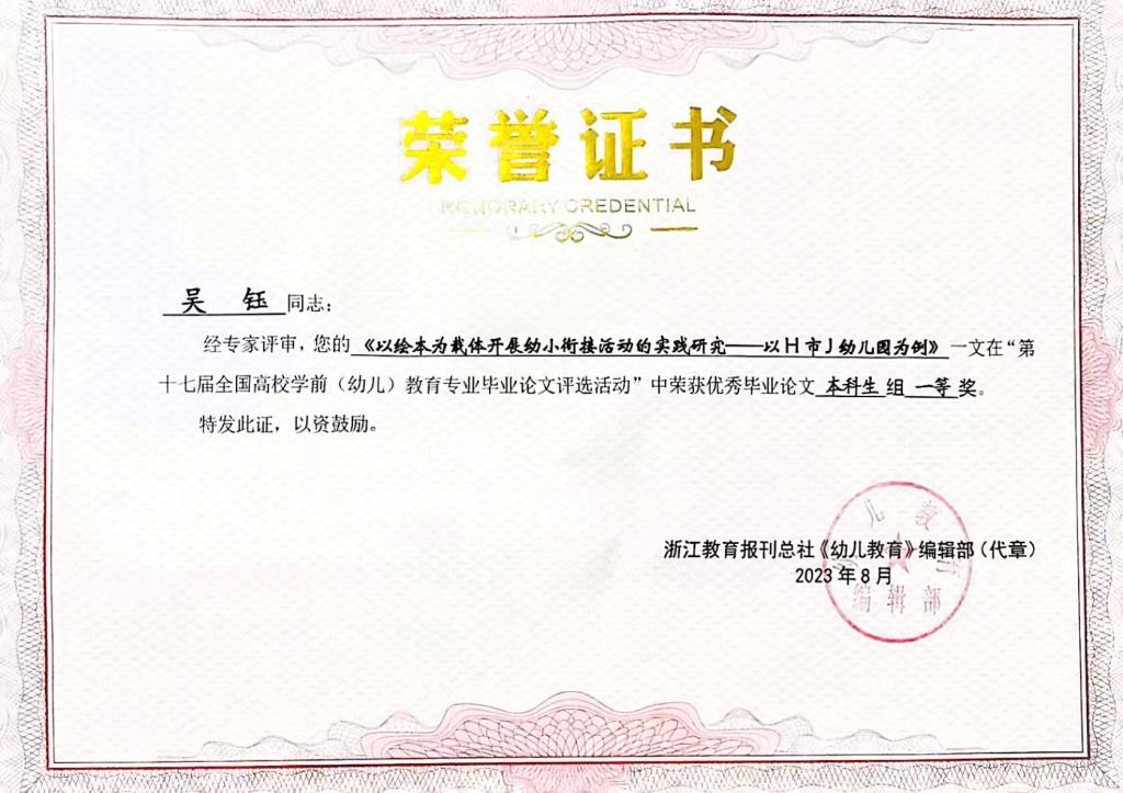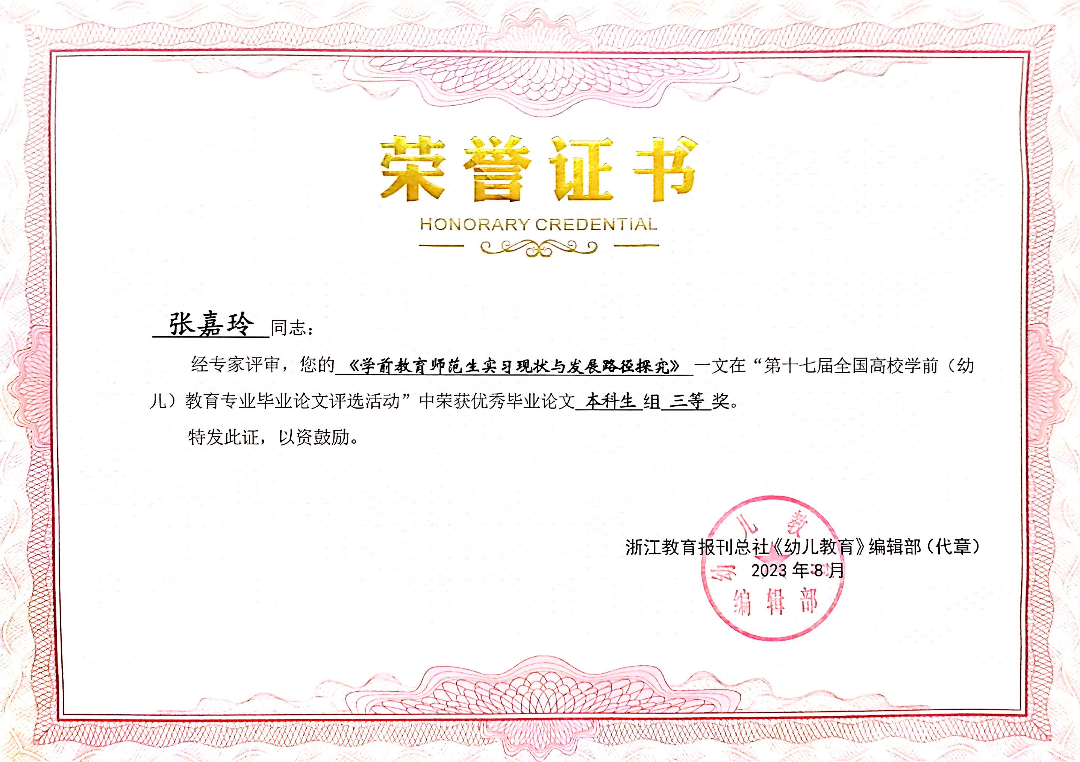 近日,由浙江省教育报刊总社《幼儿教育》编辑部主办的第十七届全国高校学前(幼儿)教育专业优秀毕业论文评选活动结果揭晓。304AM永利集团教师教育学院学前教育专业选送的论文分别荣获本科生组一、二、三等奖。